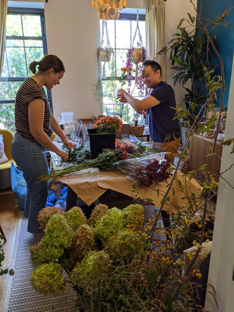 Normally “getting ready” photos are of suits and ties. In our case, we planned and catered the wedding ourselves – of course with the help of Catherine, Claire, and Kris, aka The Brickyard). And in true Brickyard fashion, this story starts with flowers and our to do list in the kitchen.